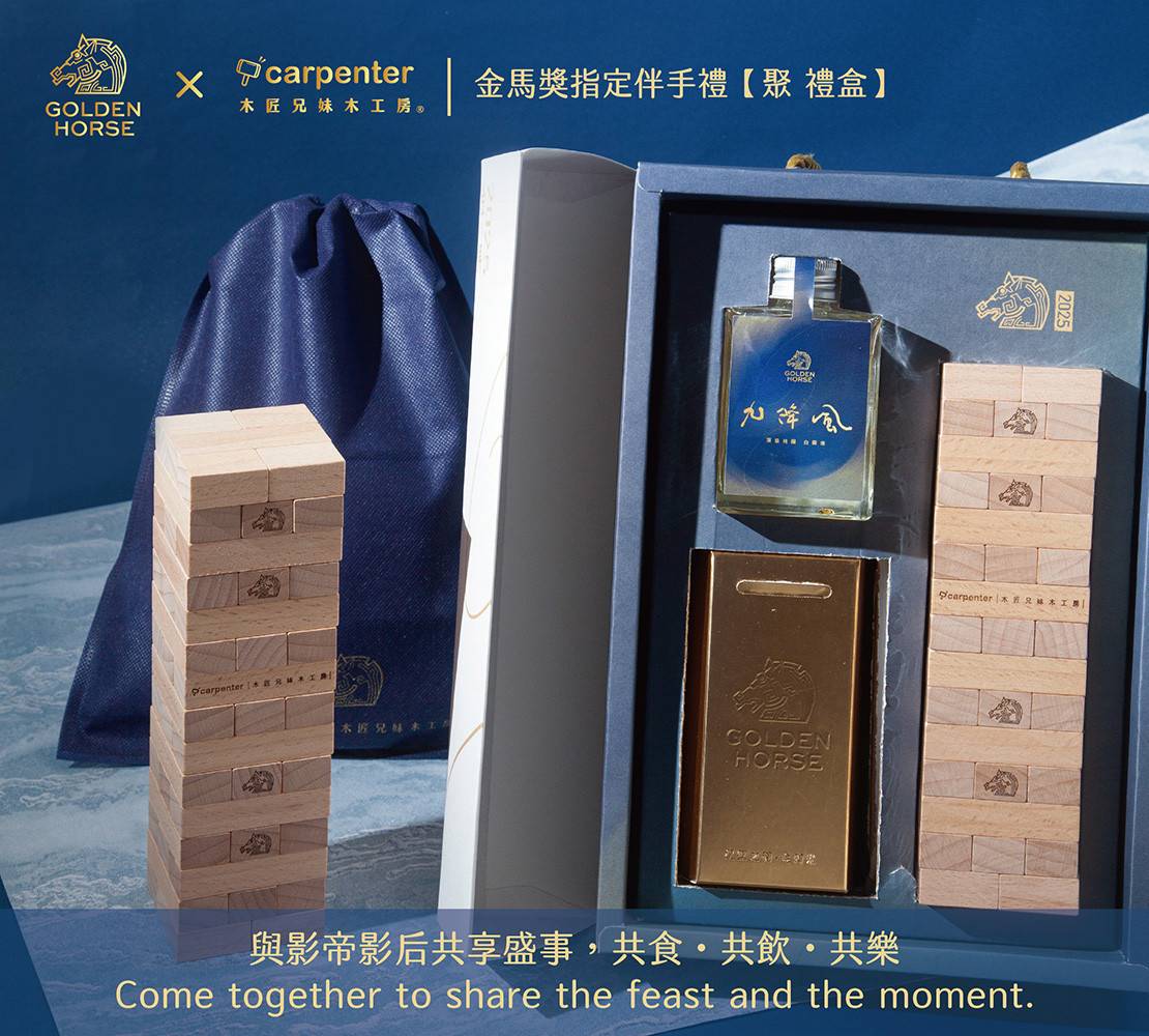 以永續理念打造的「實木疊疊樂」,共有62顆木塊,象徵每一幕堆疊,每一格都是匠心的印記,也是對金馬62年光影歲月的禮敬。